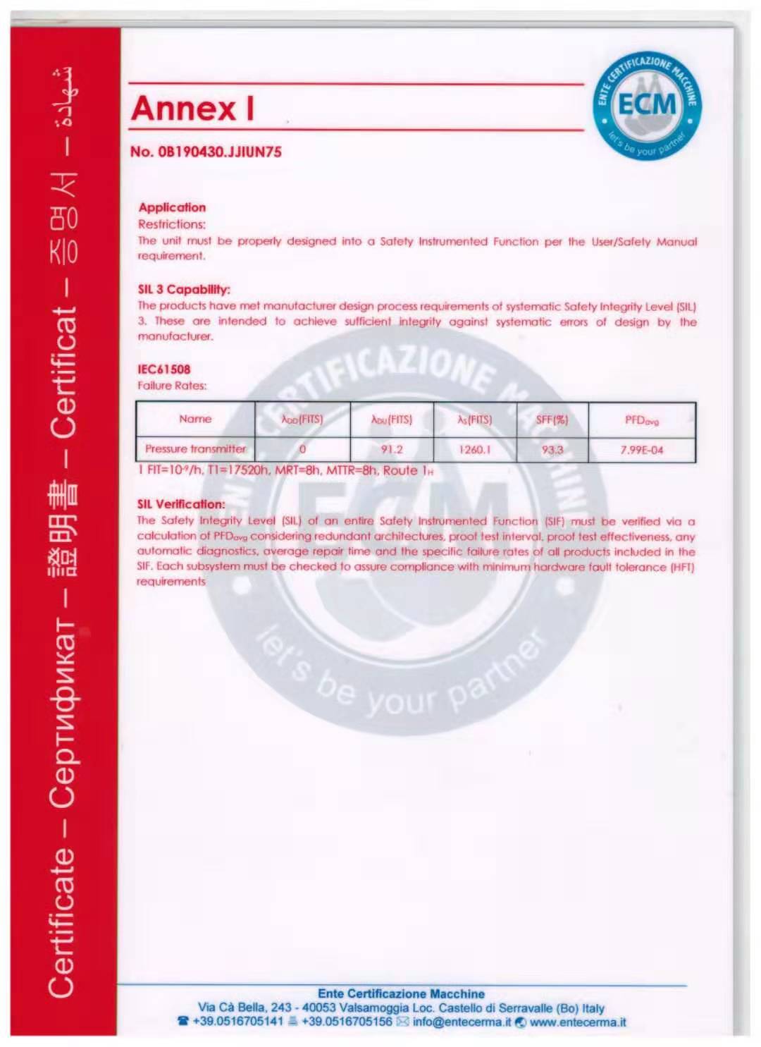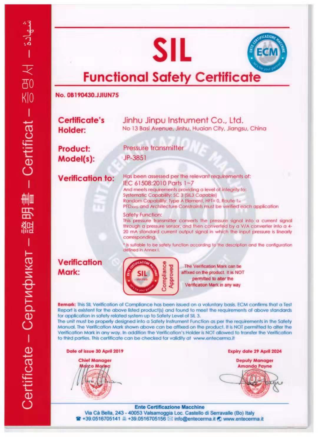 以下圖片為金湖金普儀表獲得的SIL2認證,該證書證明了變送器質(zhì)量優(yōu)秀,獲得廣大用戶認可。