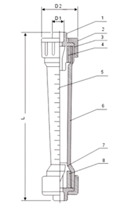 1.接管 2.螺帽 3.“0”密封圈 4.上止擋 5.刻度尺 6.錐管 7.浮子 8.下止擋 |