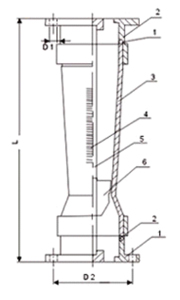 1.法蘭 2. “0”密封圈 3. 錐管 4. 刻度尺 5.導(dǎo)桿 6.浮子 |