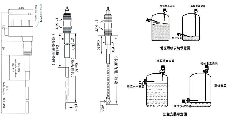 四、射頻導(dǎo)納物位計外形尺寸圖及安裝示意圖: