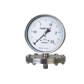 膜片壓力表由測(cè)量系統(tǒng)(包括法蘭接頭、波紋膜片)、傳動(dòng)指示機(jī)構(gòu)(包括連桿、齒輪傳動(dòng)機(jī)構(gòu)、指針和度盤)和外殼(包括表殼和罩圈)等組成。外殼為防濺結(jié)構(gòu),具有較好的密性,故能保護(hù)其內(nèi)部機(jī)構(gòu)免受污穢浸入。